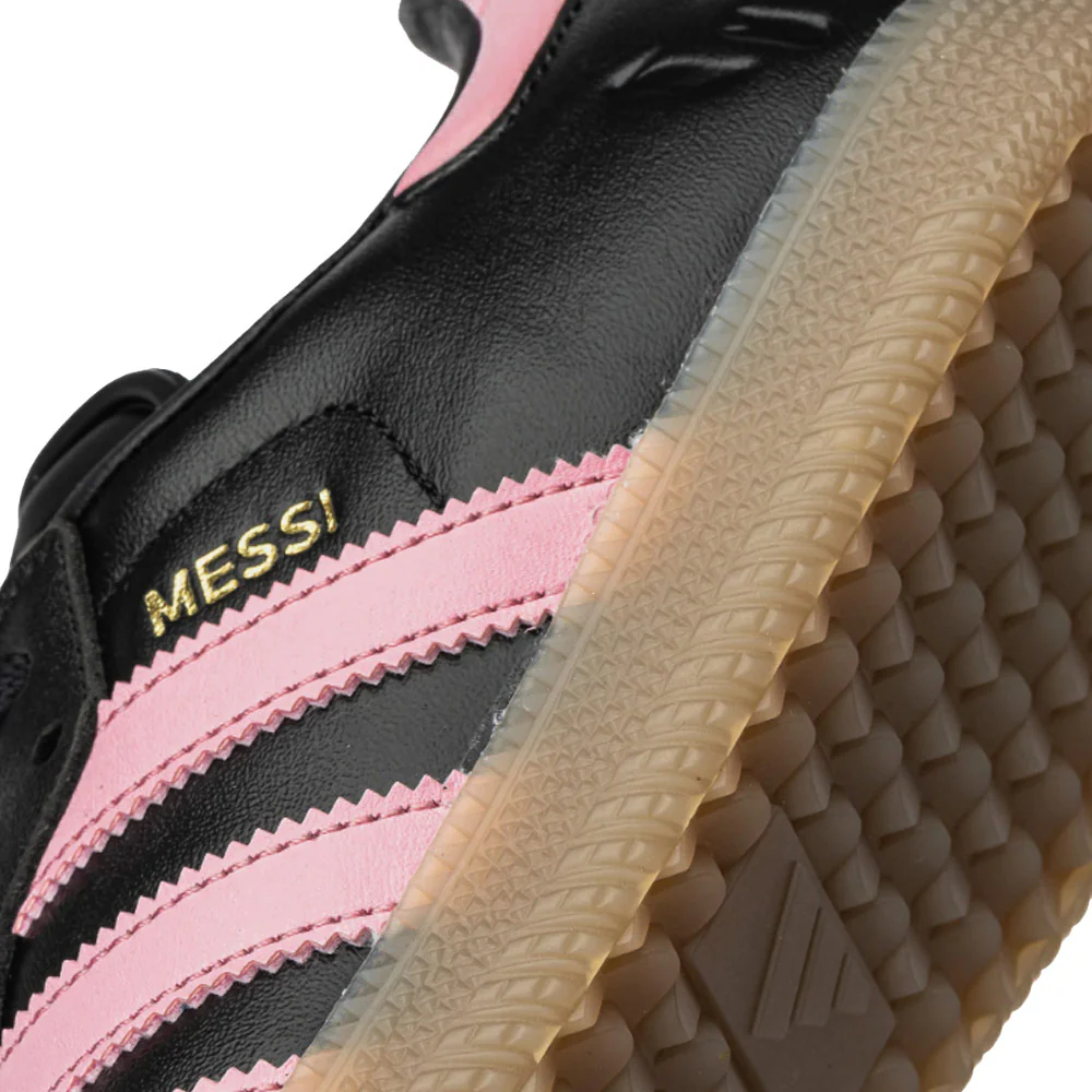 Honor a football prodigy by adorning yourself in the signature colors of his championship-winning team. Crafted to enhance agility both on and off the indoor soccer field, these exclusive adidas Samba sneakers feature the iconic pink and black hues. Gleaming gold accents serve as a nod to that historic victory in Qatar, while Messi's revered name and logo symbolize the team's iconic number 10. Ensuring traction with every step, the gum rubber outsole beneath these shoes ensures you're always ready to pivot and maneuver effortlessly.